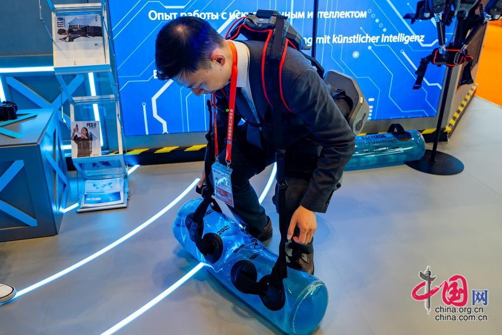 觀眾體驗外骨骼機器人在工作中的實際應(yīng)用。中國網(wǎng)記者