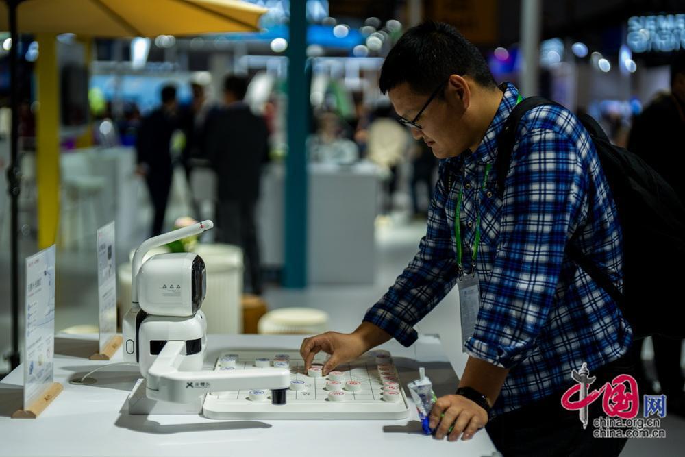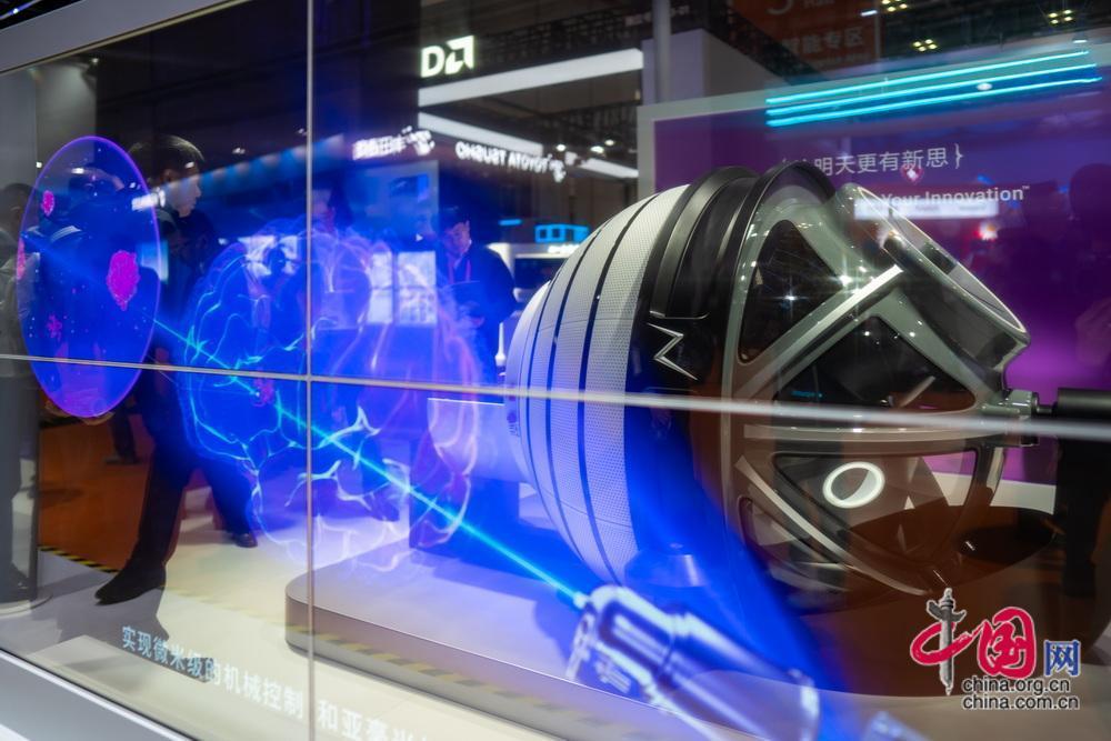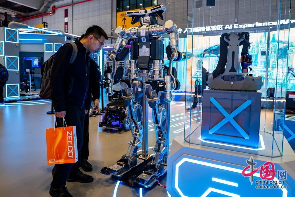 觀眾在智能裝備展示區(qū)圍觀新型外骨骼機器人。中國網(wǎng)記者