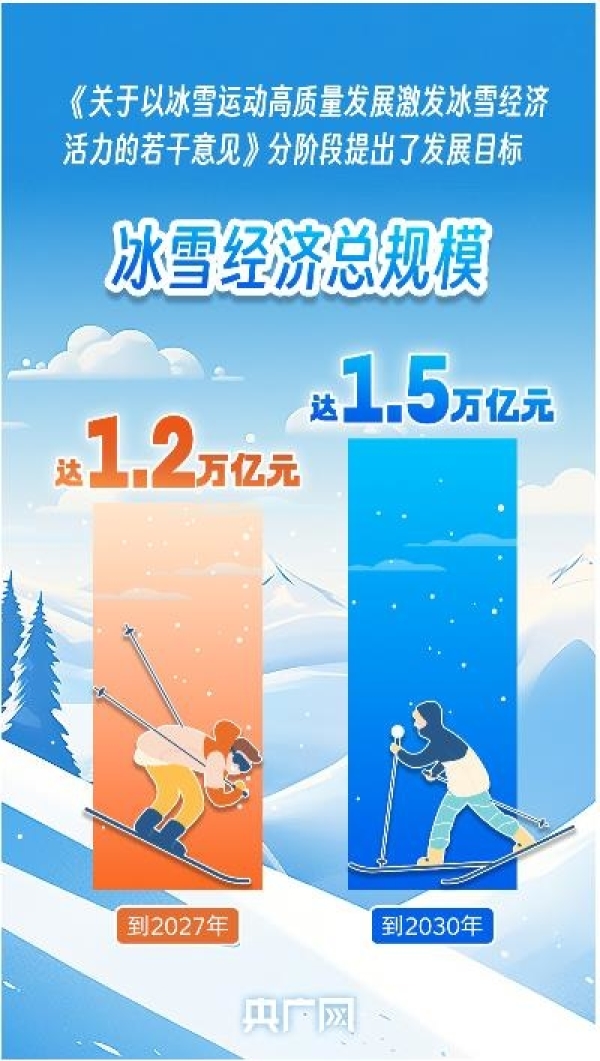 近日,國務院辦公廳公開發(fā)布《關于以冰雪運動高質量發(fā)展激發(fā)冰雪經(jīng)濟活力的若干意見》(以下簡稱《意見》),分階段提出發(fā)展目標:到2027年,冰雪運動場地設施更加完善,服務水平顯著提升,冰雪運動更加廣泛開展,冰雪經(jīng)濟總規(guī)模達1.2萬億元。到2030年,冰雪經(jīng)濟主要產(chǎn)業(yè)鏈條實現(xiàn)高水平協(xié)調融合發(fā)展,冰雪消費成為擴大內需的重要增長點,冰雪經(jīng)濟總規(guī)模達1.5萬億元。