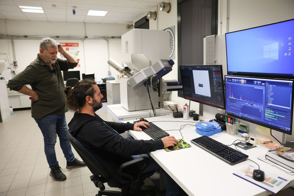 11月6日,意大利帕多瓦大學文化遺產(chǎn)學院教授馬西莫·維達萊(左)與研究人員在實驗室討論青銅獅樣本檢測分析過程。新華社記者李京攝