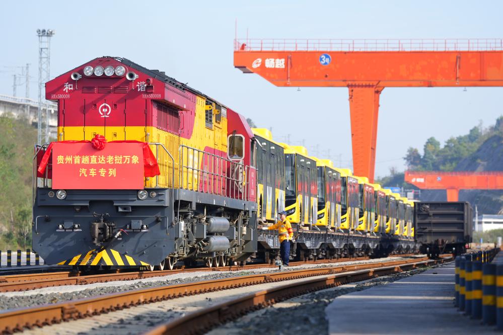 10月底,55臺“貴州造”新能源客車搭乘西部陸海新通道國際鐵路聯(lián)運班列,從貴陽國際陸港都拉營站開出,不久后抵達老撾萬象。