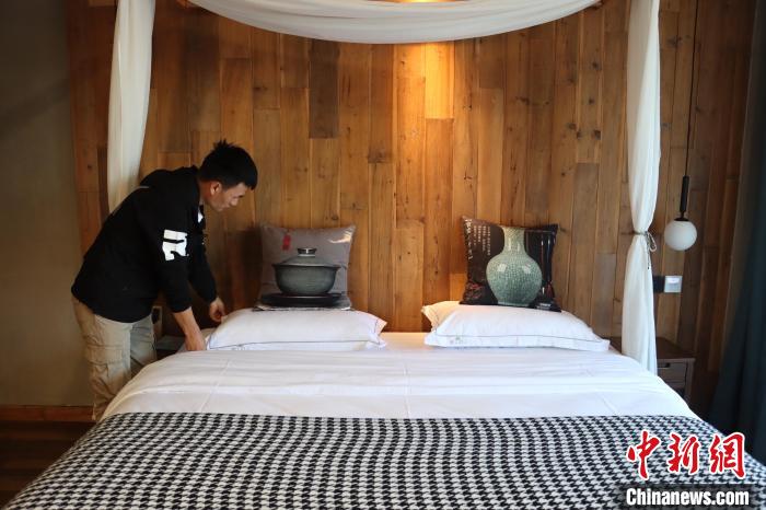 11月8日,浙江龍泉溪頭村,葉柏青打理充滿青瓷文化的房間?! ≈芙?攝
