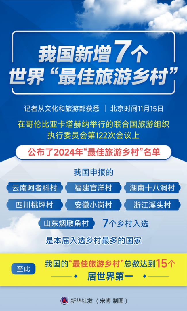 記者從文化和旅游部獲悉,北京時間11月15日,在哥倫比亞卡塔赫納舉行的聯(lián)合國旅游組織執(zhí)行委員會第122次會議上,公布了2024年“最佳旅游鄉(xiāng)村”名單,我國申報的云南阿者科村、福建官洋村、湖南十八洞村、四川桃坪村、安徽小崗村、浙江溪頭村、山東煙墩角村7個鄉(xiāng)村入選,是本屆入選鄉(xiāng)村最多的國家。