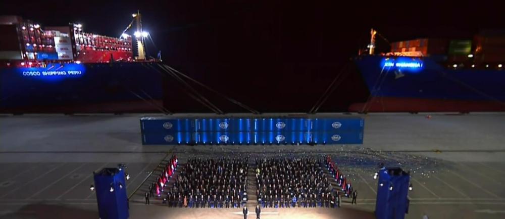 開港儀式現(xiàn)場(chǎng)停泊著兩艘集裝箱輪。其中一艘中遠(yuǎn)“秘魯輪”剛剛抵港,而另一艘“新上海輪”即將離港前往上海。“從錢凱到上?!?,已成為現(xiàn)實(shí)。