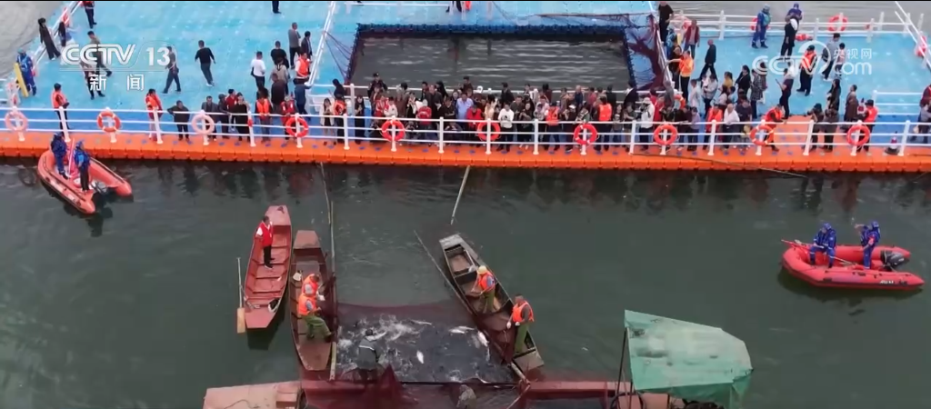 11月16日,江西宜春袁州區(qū)飛劍潭水庫迎來生態(tài)魚的冬季集中捕撈。隨著漁網(wǎng)逐漸收攏,魚躍歡騰,當?shù)亟璐伺e辦各類活動,讓游客也體驗魚兒豐收的喜悅。