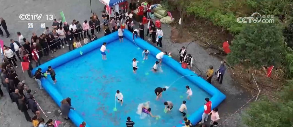 在捕魚現(xiàn)場,當?shù)剡€設(shè)立了捕魚體驗區(qū),大人們協(xié)力拉緊繩索收攏大網(wǎng),體驗豐收的喜悅;小朋友們也擼起袖子,挽起褲腿用網(wǎng)撈魚,沉浸式體驗捕魚的樂趣。