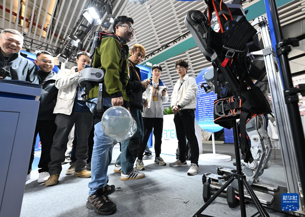 11月19日,在2024年世界互聯(lián)網(wǎng)大會“互聯(lián)網(wǎng)之光”博覽會上,參觀者體驗外骨骼機器人協(xié)助搬運重物。