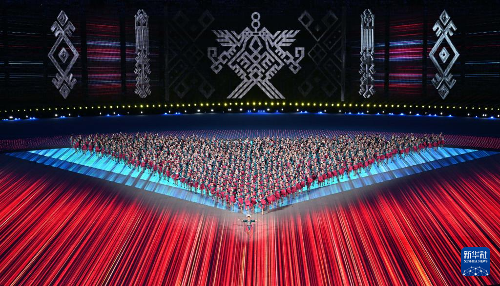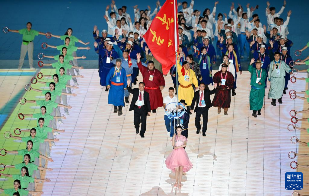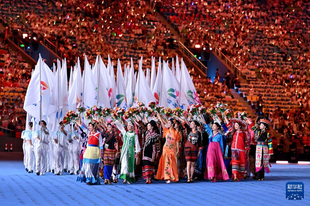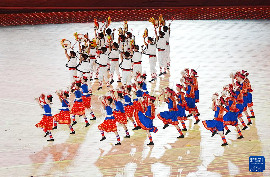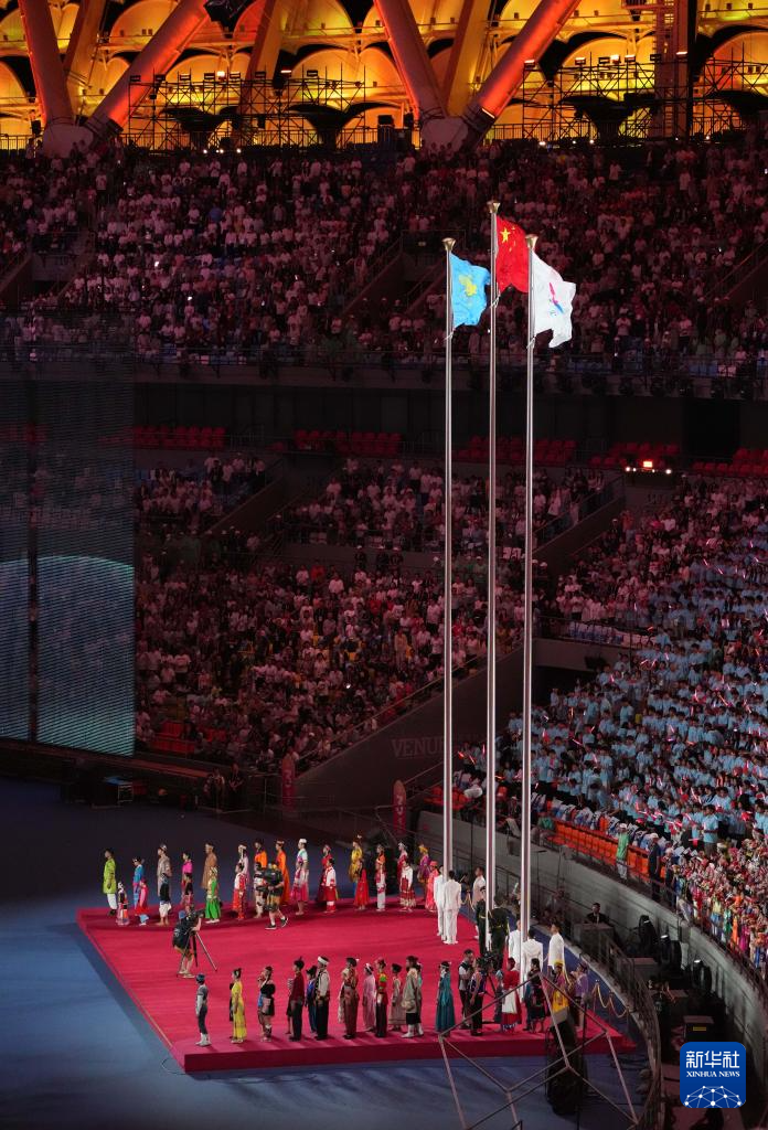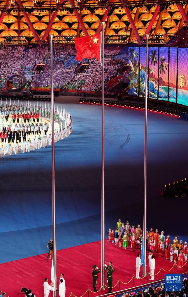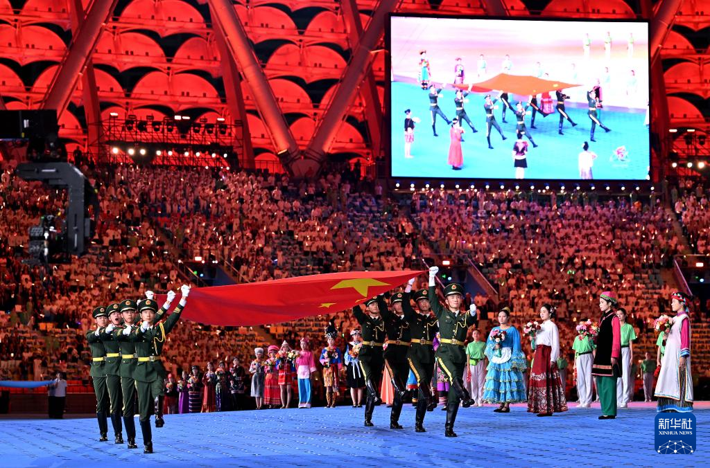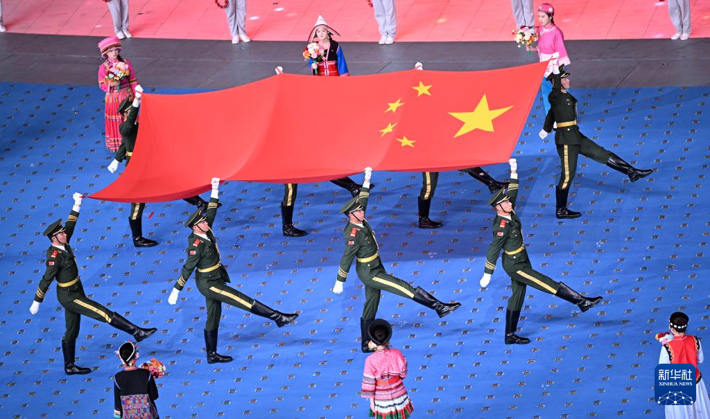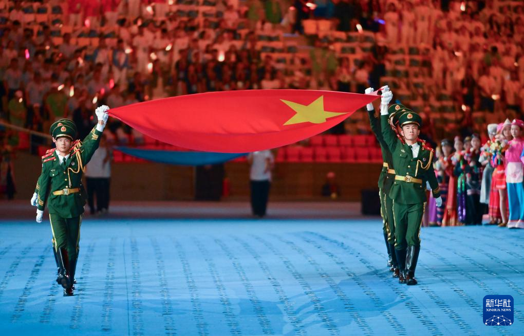 11月22日,開幕式現(xiàn)場升起中華人民共和國國旗、中華人民共和國少數(shù)民族傳統(tǒng)體育運動會會旗和中華人民共和國第十二屆少數(shù)民族傳統(tǒng)體育運動會會旗。