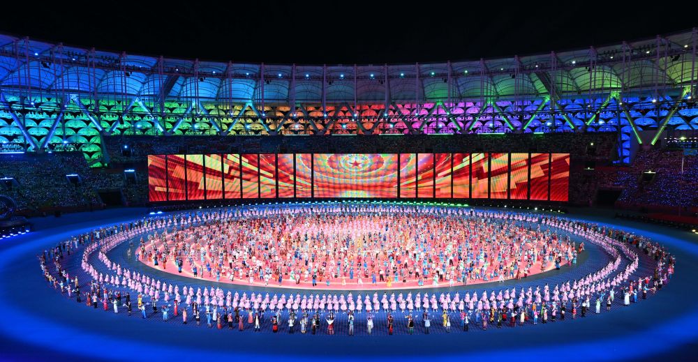 舞臺(tái)中間是一個(gè)圓形地屏,地屏外圈,導(dǎo)演組專門增加“星空矩形”地毯,圍繞中心地屏影像始終保持圓形圖案,構(gòu)成“同心圓”;在入場(chǎng)儀式、節(jié)目展演、點(diǎn)燃火炬等多個(gè)環(huán)節(jié),身穿各民族傳統(tǒng)服飾的參賽人員、表演者等,多次在舞臺(tái)匯聚成“同心圓”;“一顆心,一個(gè)圓,一齊擁抱緊相連……”“同心圓”概念也在主題曲中彰顯。