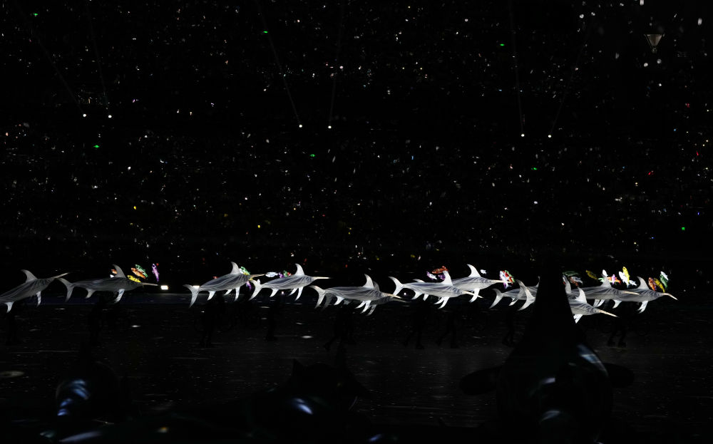 在全場(chǎng)觀眾“哇”的一聲驚嘆中,整座體育場(chǎng)化身星辰大海。騎自行車、滑輪滑、腳踩平衡車的演員們手舉海龜、鯊魚、海豚等形象魚貫而入,讓觀眾如置海底。隨后,高鐵飛馳、深海探測(cè)、火箭發(fā)射、太空行走等畫面在星海中逐一呈現(xiàn),展現(xiàn)了我國(guó)在高科技領(lǐng)域的發(fā)展成就,帶來生動(dòng)的沉浸式體驗(yàn)。
