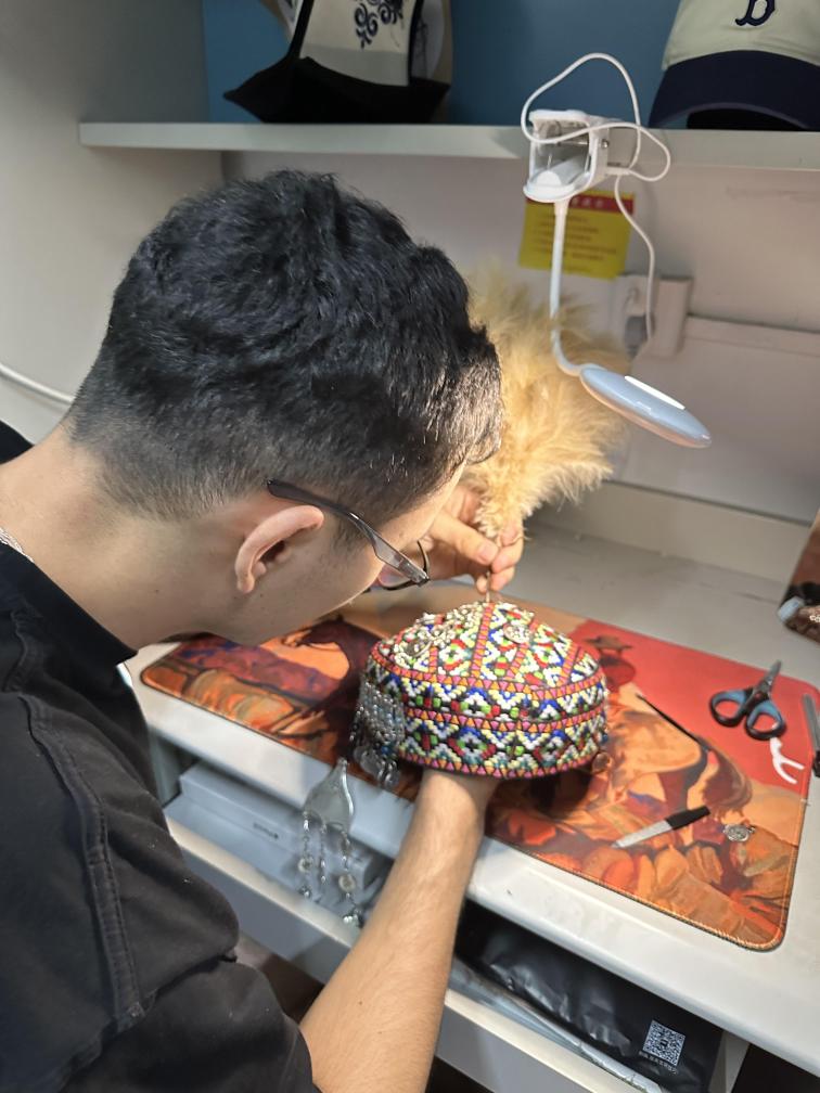 在“哈薩克非遺工坊”,唐寶手拿針線對一頂哈薩克族花帽進(jìn)行設(shè)計(jì)。受訪者供圖