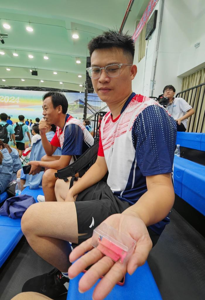 “香港隊(duì)很厲害,沒想到他們還給我們準(zhǔn)備了禮物,挺驚喜的?!蔽鞑仃?duì)毽球運(yùn)動(dòng)員韋盛森從褲兜里掏出一個(gè)精致的粉色毽球掛飾給記者看,并懊惱自己沒有準(zhǔn)備禮物?!百惡笪覀兒拖愀坳?duì)說了很多互相鼓勵(lì)的話,我們希望找機(jī)會(huì)再和他們交流。”