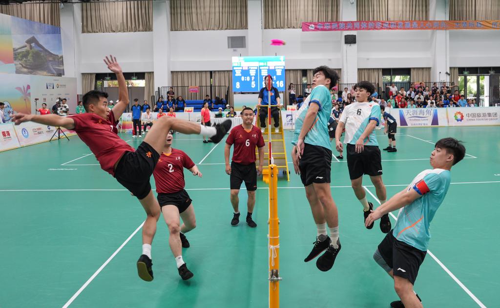 11月24日,第十二屆全國少數(shù)民族傳統(tǒng)體育運(yùn)動(dòng)會(huì)毽球男子三人小組賽在海南省三亞市舉行,圖為天津隊(duì)和廣西隊(duì)比賽現(xiàn)場。新華社記者 晉美多吉 攝