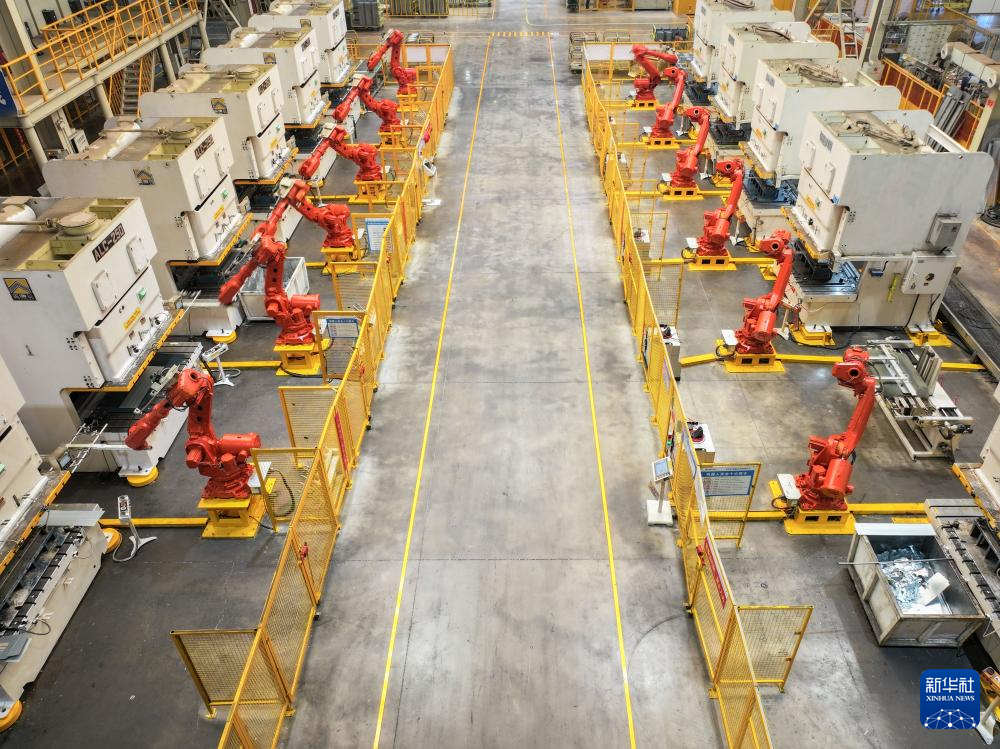 9月27日,機(jī)械臂在位于寧鄉(xiāng)市金洲新城的格力暖通制冷設(shè)備有限公司生產(chǎn)線上作業(yè)(無人機(jī)照片)。新華社記者 陳澤國 攝