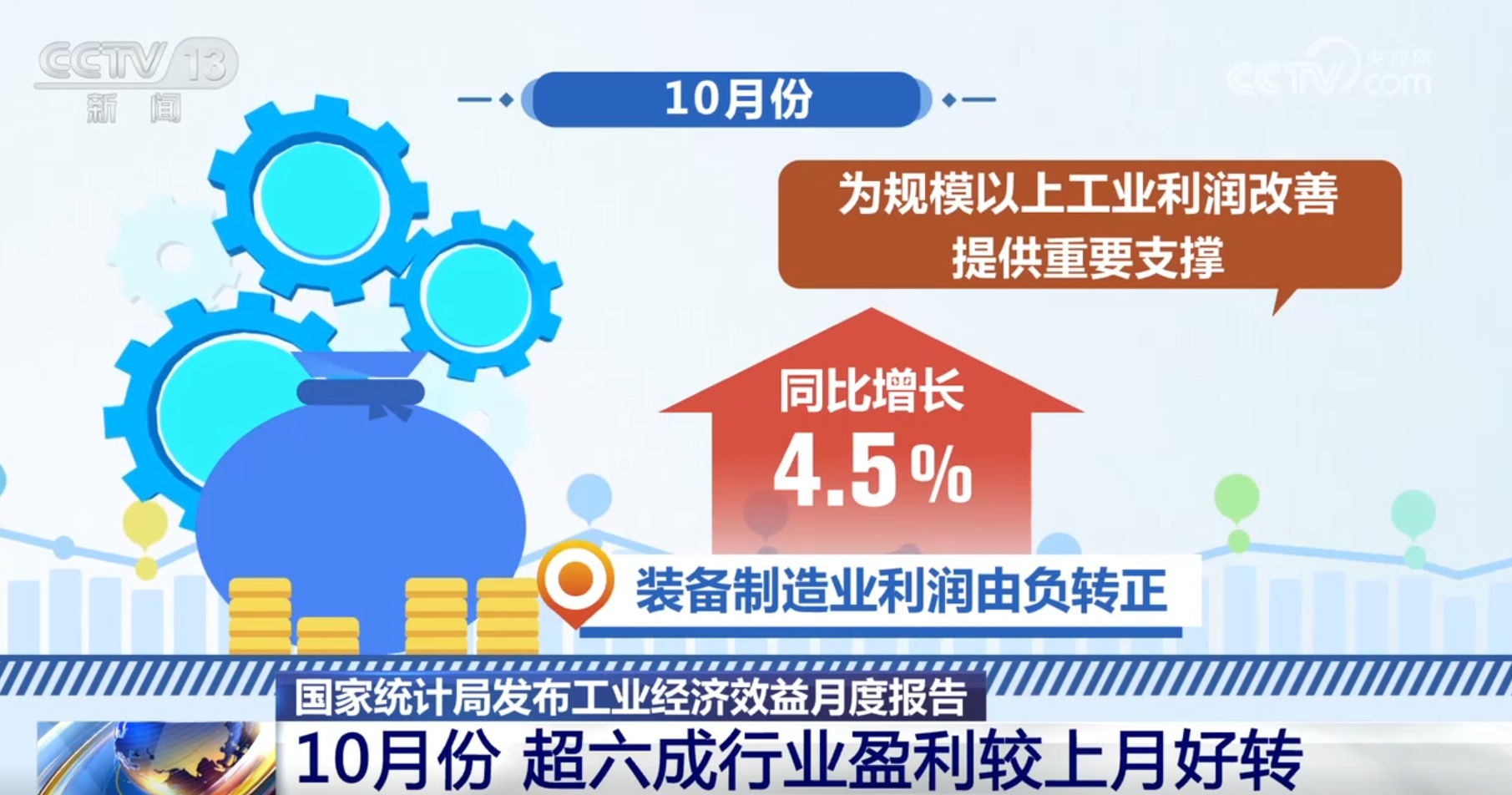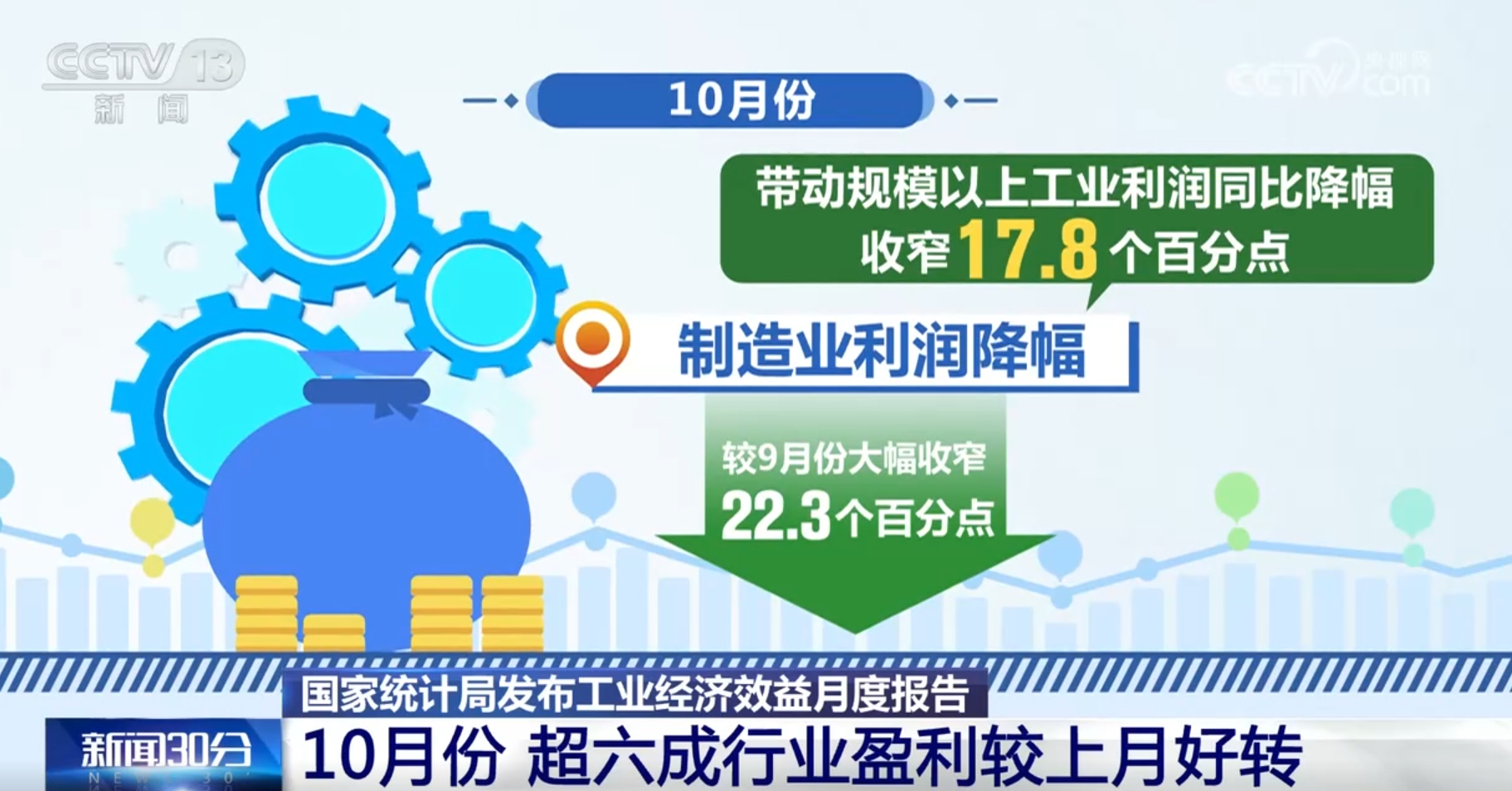 國家統(tǒng)計局最新發(fā)布的數(shù)據(jù)顯示,10月份,隨著存量政策及一攬子增量政策協(xié)同發(fā)力、持續(xù)顯效,規(guī)模以上工業(yè)企業(yè)生產(chǎn)穩(wěn)定增長,企業(yè)利潤當月降幅明顯收窄,多數(shù)行業(yè)盈利較上月好轉。