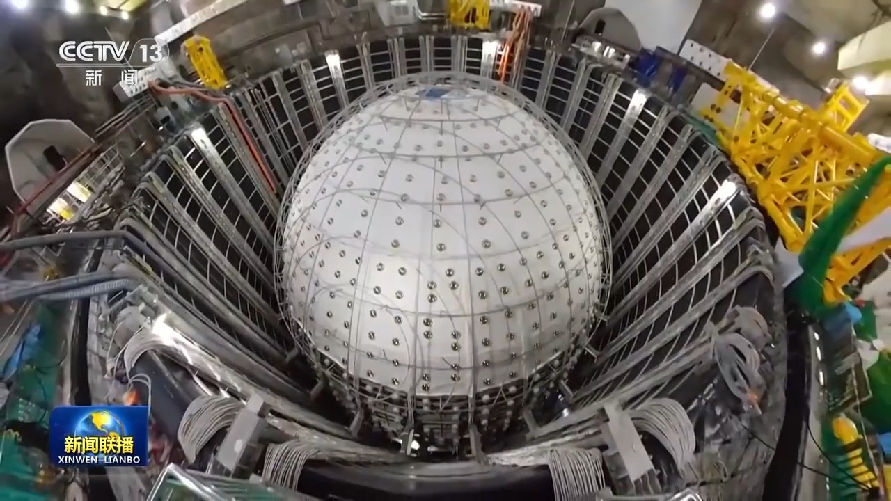 總臺央視記者 帥俊全:探測器主體建成之后,在這個約15層樓高的水池內(nèi)部將會注滿超純水,然后自上而下在有機(jī)玻璃球體內(nèi)部置換為液體閃爍體。從明年開始,整個裝置將正式運(yùn)行,開始捕獲、探測中微子,設(shè)計(jì)壽命為30年。