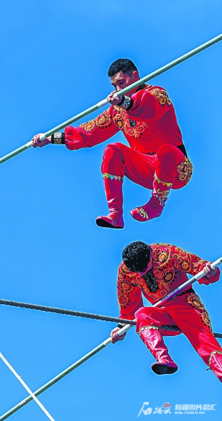 11月24日,新疆代表團達瓦孜隊隊員在展示空中“飛人”技藝。