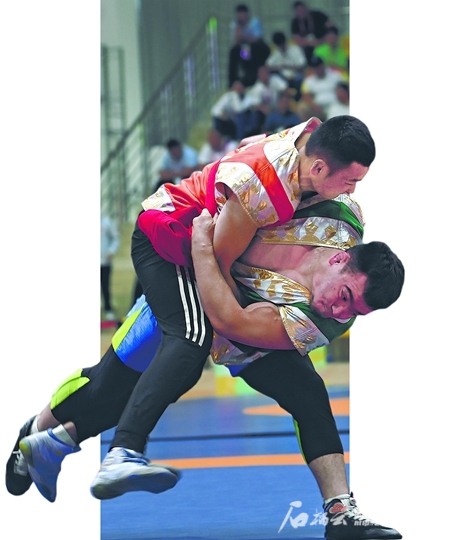 11月27日,新疆代表團運動員亞沙爾·提力瓦力地(右)在民族式摔跤且里西項目74公斤級比賽中獲得一等獎。
