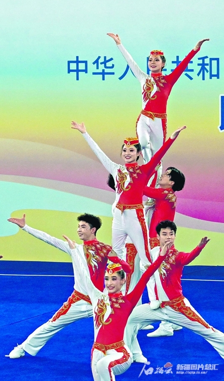 11月25日,新疆代表團民族健身操隊隊員正在比賽。