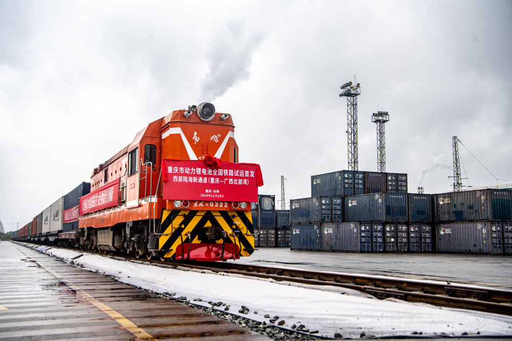 11月19日,重慶市動(dòng)力鋰電池全國(guó)鐵路試運(yùn)首發(fā)班列在重慶長(zhǎng)壽渝巴專用鐵路等待發(fā)車。新華社記者 唐奕 攝
