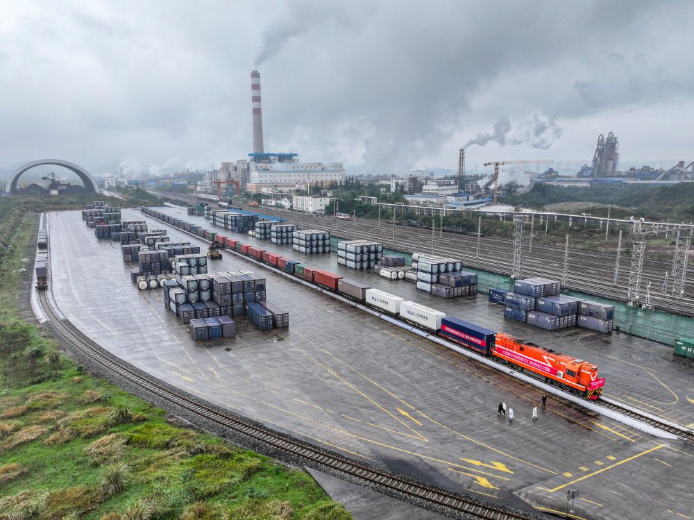 11月19日,重慶市動(dòng)力鋰電池全國(guó)鐵路試運(yùn)首發(fā)班列在重慶長(zhǎng)壽渝巴專用鐵路等待發(fā)車(無人機(jī)照片)。新華社記者 唐奕 攝