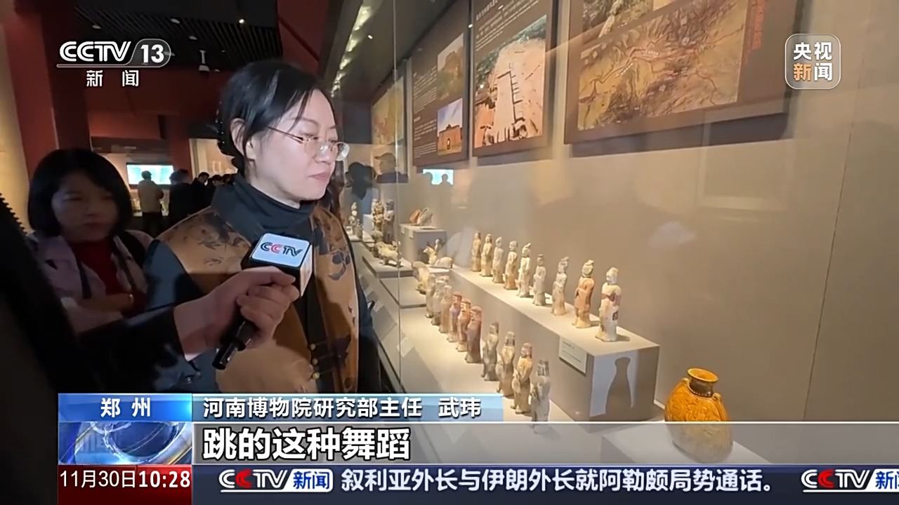 河南博物院研究部主任 武瑋:樂舞者的形象高鼻深目,戴有一種翻帽,穿的是那種圓領(lǐng)或者是翻領(lǐng)的長袍。當(dāng)時(shí)的人稱為胡人的形象,跳的這種舞蹈,包括使用的樂器,可能最主要是來自中亞。