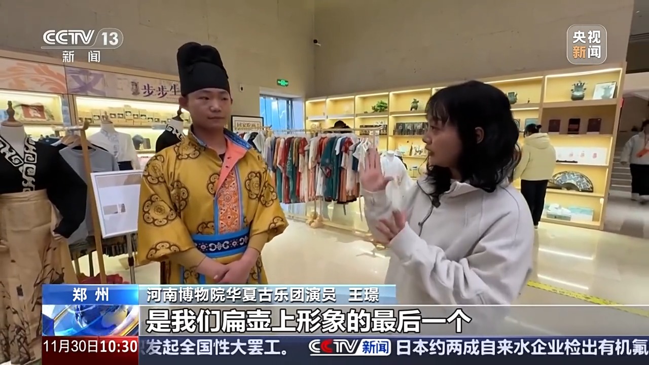 河南博物院華夏古樂團(tuán)演員 王璟:我們也是依據(jù)一些文獻(xiàn)記載,比如說我們有一個(gè)動作是提臀動胯,是當(dāng)時(shí)的一個(gè)胡人的舞蹈形象。還有揚(yáng)眉動目是我們扁壺上形象的最后一個(gè)。