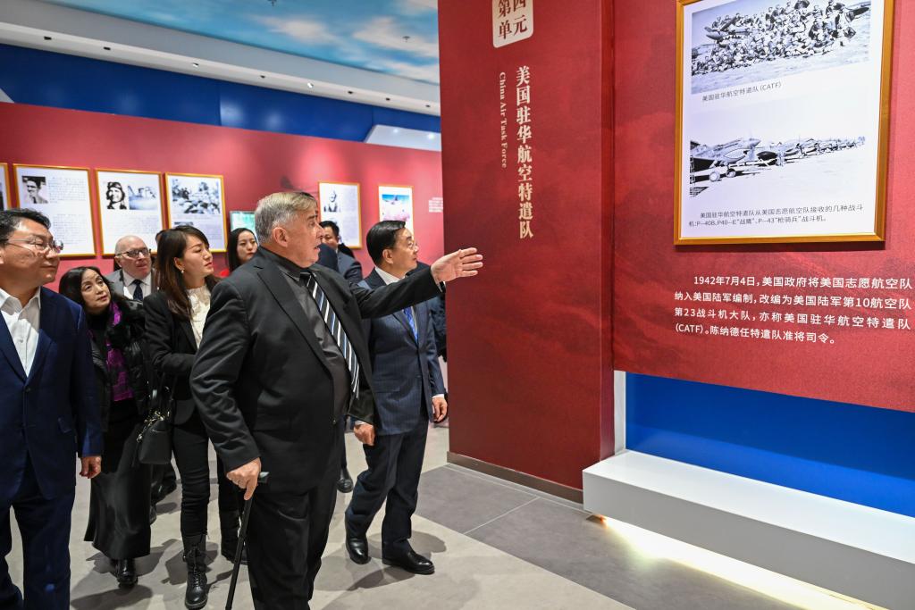 11月30日,美中航空遺產(chǎn)基金會代表團(tuán)成員在烏魯木齊文化中心展覽館觀看“銘記英雄——飛虎隊(duì)主題歷史圖片展巡展(新疆)”。新華社記者 丁磊 攝
