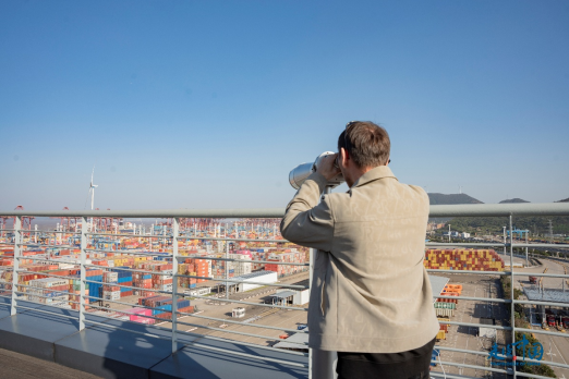 記者們站在觀景平臺,通過望遠鏡親眼見證了全球最繁忙集裝箱港口之一的現(xiàn)代化作業(yè),他們爭相與壯觀的碼頭場景合影留念。來自哈薩克斯坦《誠實報》社會文化部主任納烏雷茲別克·薩爾沙耶夫在接受環(huán)球網(wǎng)記者采訪時說道“寧波舟山港的運作效率和智能化管理令人贊嘆,它無疑是全球物流行業(yè)的標(biāo)桿?!?/p>
