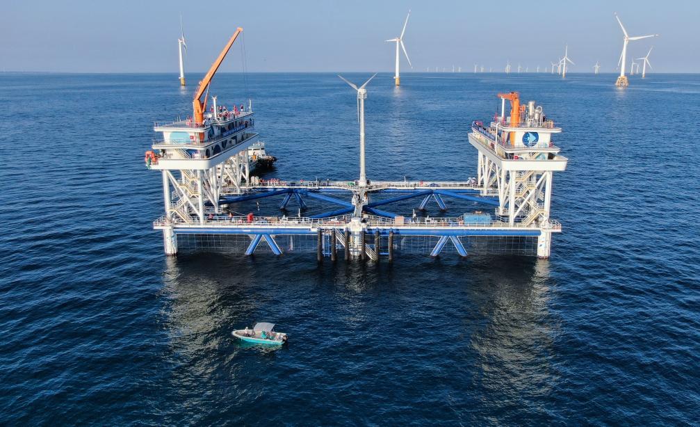 這是中廣核“伏羲一號”風漁融合網(wǎng)箱平臺(無人機照片)。新華社記者鄧華 攝