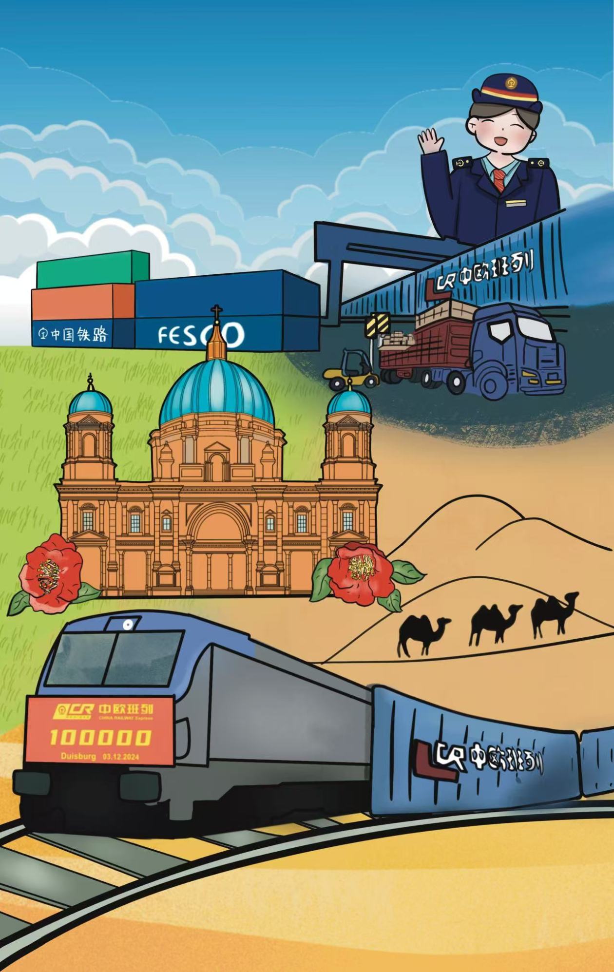 當(dāng)?shù)貢r(shí)間12月3日9時(shí)10分,從中國(guó)重慶團(tuán)結(jié)村中心站開出的第10萬列中歐班列X8083次順利抵達(dá)德國(guó)杜伊斯堡。截至目前,中歐班列已通達(dá)歐洲25個(gè)國(guó)家227個(gè)城市,連接11個(gè)亞洲國(guó)家超過100個(gè)城市,服務(wù)網(wǎng)絡(luò)基本覆蓋亞歐大陸全境。萬里鐵道蜿蜒伸展,“鋼鐵駝隊(duì)”通達(dá)八方,讓古老的絲綢之路煥發(fā)新的生機(jī)與活力。