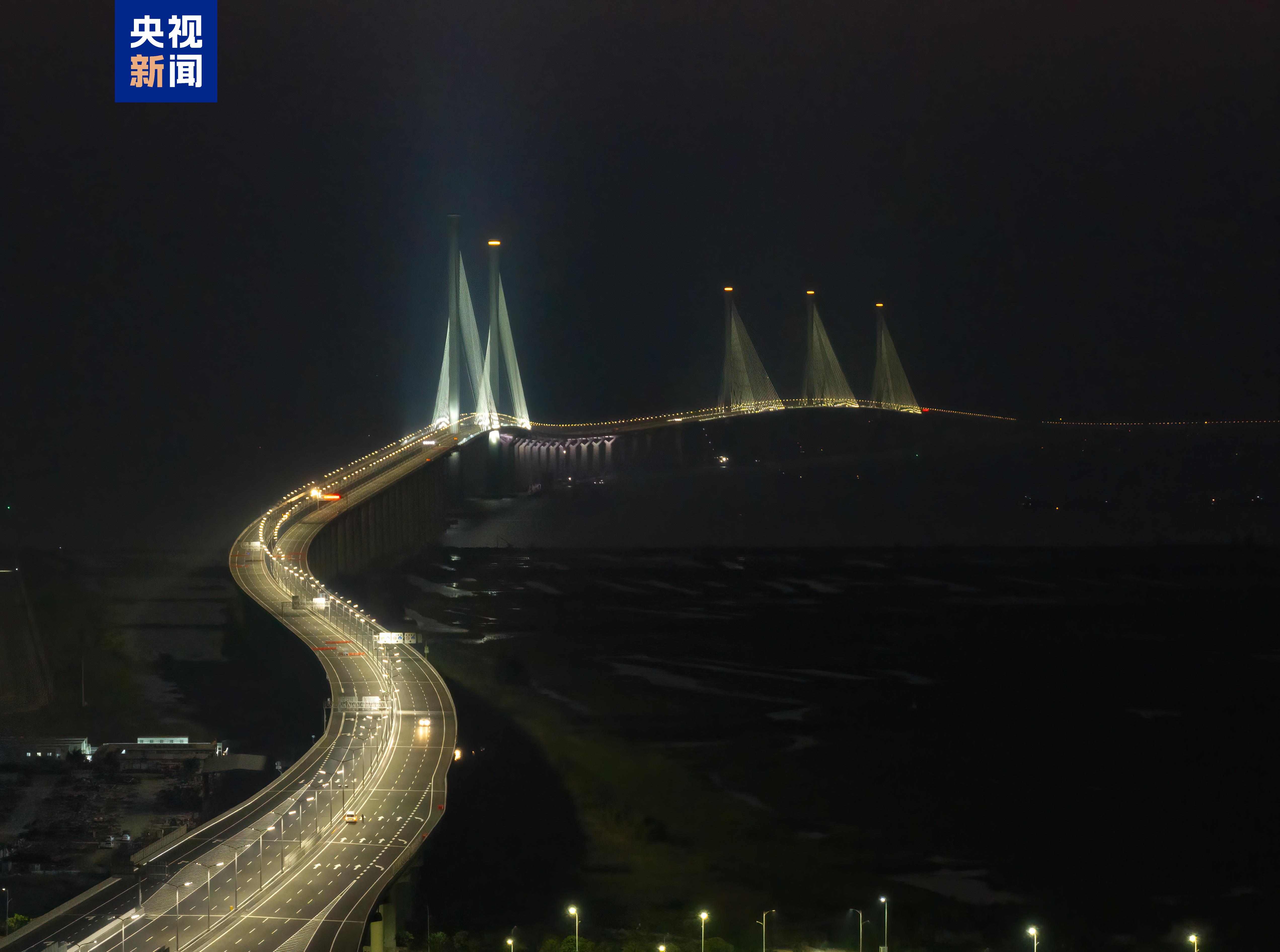 黃茅??绾Mǖ廊€布有路燈和景觀燈。夜幕下,最耀眼的是塔頂,五座“小蠻腰”主塔如同戴上了圓形“王冠”,而一條條被照亮的斜拉索仿佛燈光勾勒出的“芭蕉葉葉脈”。燈光與夜色明暗搭配、突顯出五座“小蠻腰”主塔,形成平靜柔和的照明效果。從遠處看,黃茅??绾Mǖ婪路鹨粭l珍珠,串聯(lián)起中央的五個“等腰三角形”,萬盞明燈點亮黃茅海,為粵港澳大灣區(qū)打造出一座閃耀的海上地標。