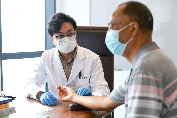 來自香港的注冊中醫(yī)師郭鈞泯(左)在深圳市中醫(yī)藥傳承發(fā)展研究院為病人看診(2023年9月4日攝)。新華社記者 毛思倩 攝