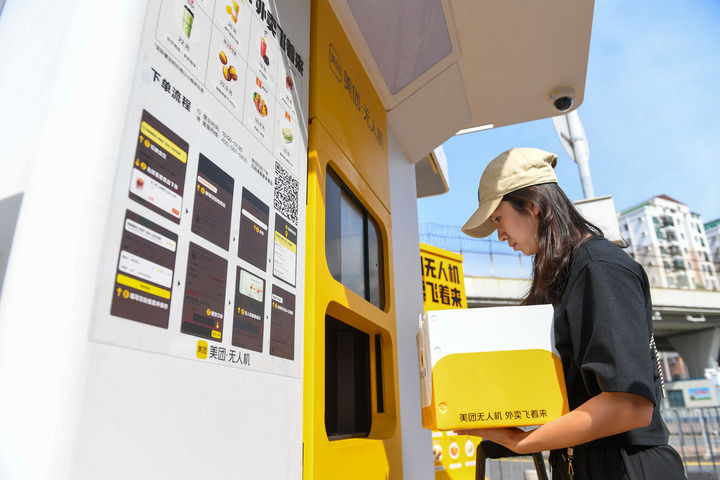 在深圳福田口岸,香港居民使用無人機外賣服務(2024年10月23日攝)。新華社記者 毛思倩 攝