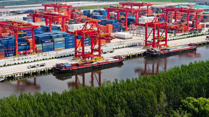 在位于京杭大運(yùn)河上的山東省濟(jì)寧港航龍拱港,貨船在裝運(yùn)集裝箱(2024年8月3日攝,無(wú)人機(jī)照片)。新華社記者 郭緒雷 攝