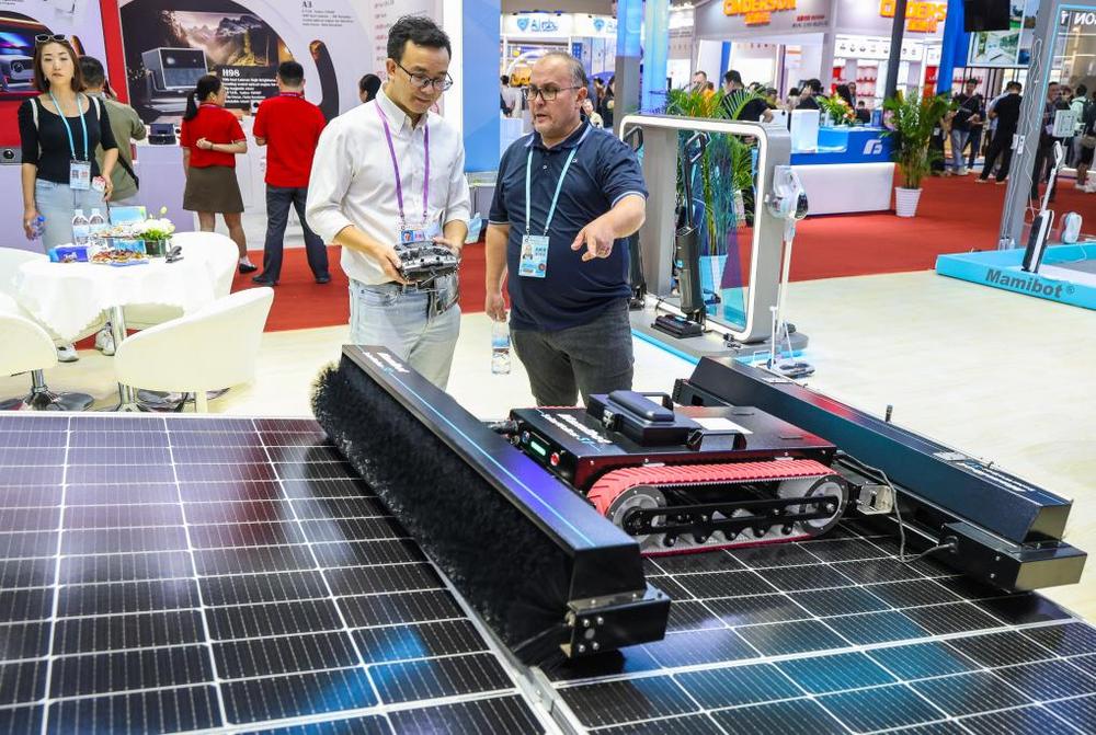 10月15日,采購商在第136屆廣交會展館了解一款太陽能面板自動清潔機(jī)器人產(chǎn)品。(新華社記者 劉大偉 攝)