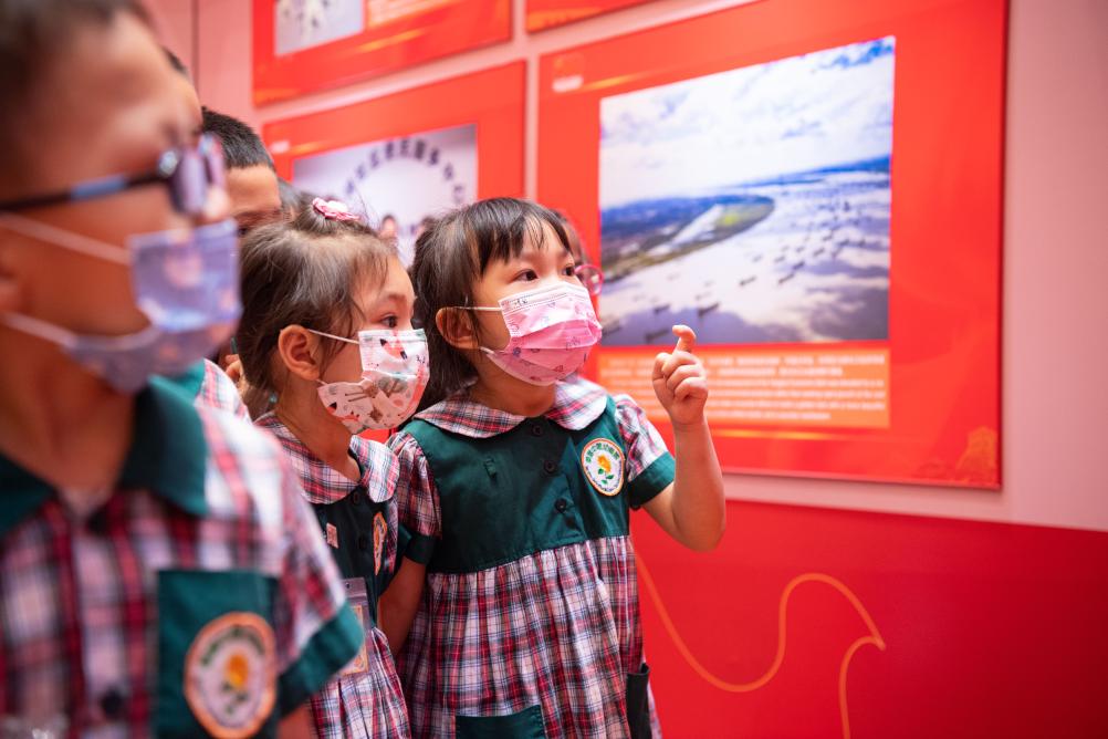 2021年7月12日,小朋友參觀在澳門舉行的“中國共產(chǎn)黨的100年”大型圖片展。新華社記者 張金加 攝