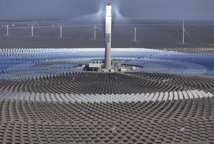 這是2024年9月12日在新疆哈密市伊吾縣淖毛湖鎮(zhèn)拍攝的國(guó)家光熱示范項(xiàng)目——熔鹽塔式50兆瓦光熱發(fā)電站(無(wú)人機(jī)照片)?! ⌒氯A社記者 胡虎虎 攝