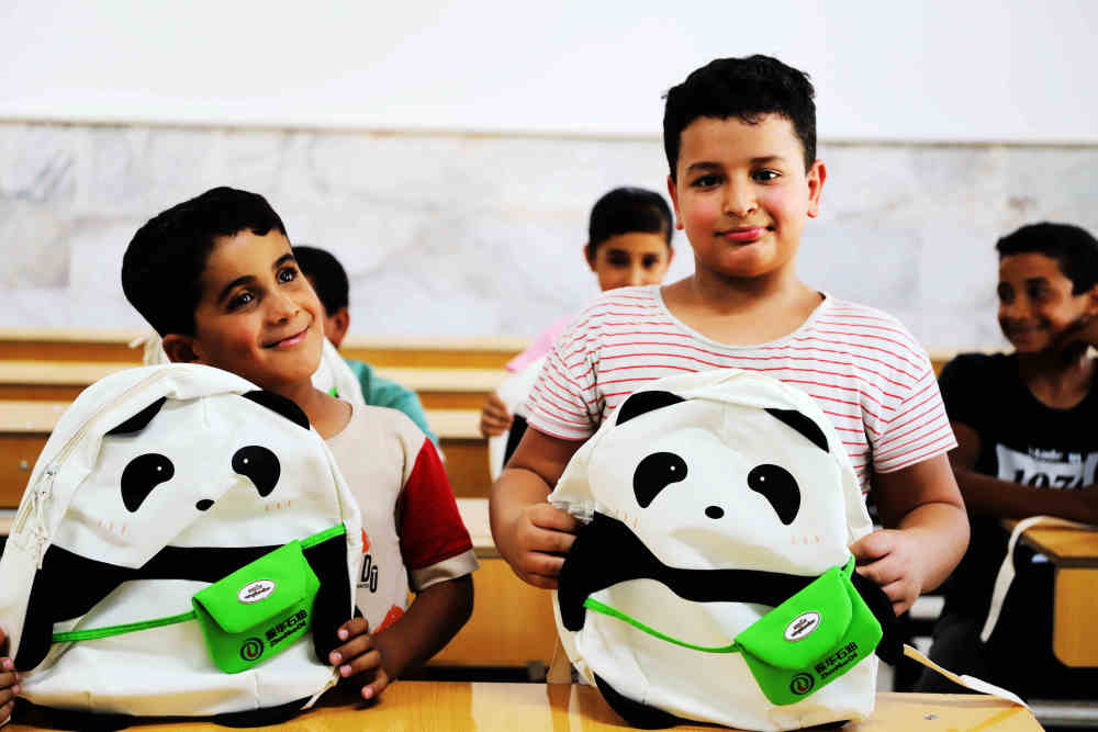 7月11日,在伊拉克巴格達,即將搬遷至振華希望學(xué)校就讀的當(dāng)?shù)貙W(xué)生收到振華石油贈送的書包。新華社發(fā)