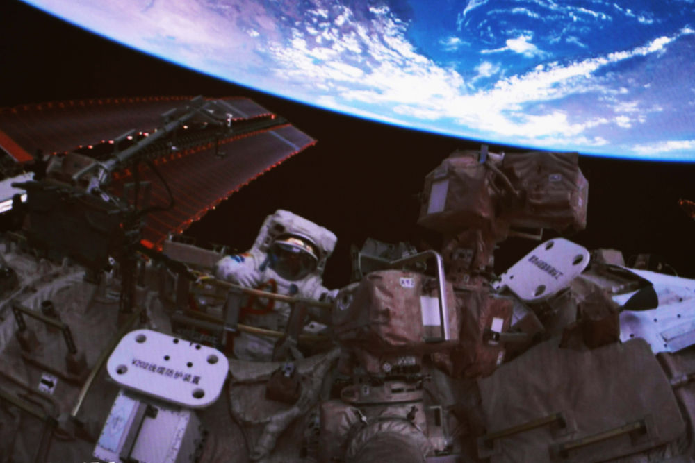 2024年7月3日在北京航天飛行控制中心拍攝的神舟十八號(hào)航天員李聰出艙的畫面。
