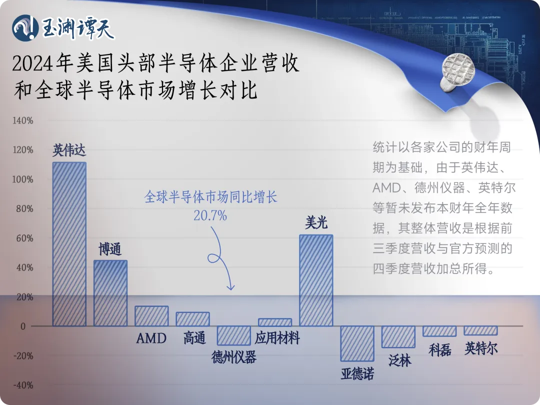 2024年,全球芯片市場都在回暖,預(yù)計同比增長20.7%。與此同時,英偉達2024年營收預(yù)計同比增長超100%,成為美國芯片市場增長最大的動力。