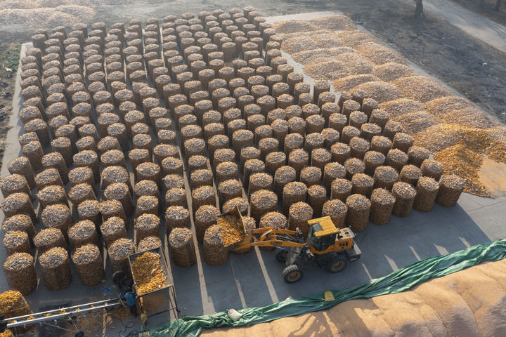 2024年11月13日,在黑龍江省肇東市一處秋糧晾曬場(chǎng),海城雙麗現(xiàn)代農(nóng)機(jī)專(zhuān)業(yè)合作社的農(nóng)民駕駛農(nóng)機(jī)堆放玉米(無(wú)人機(jī)照片)。新華社記者 謝劍飛 攝