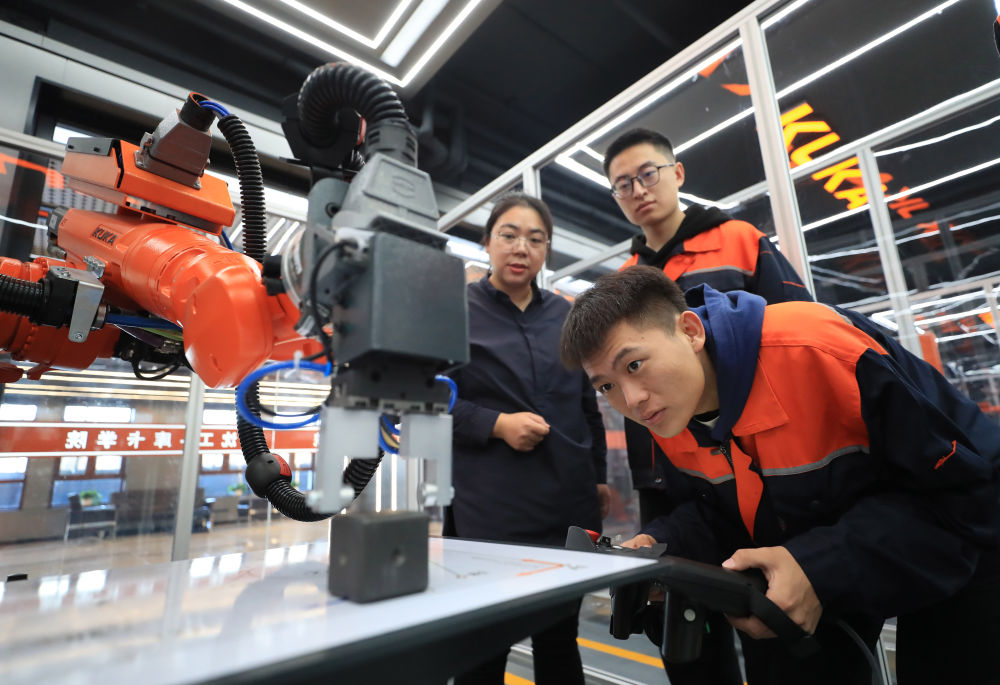 產(chǎn)教融合促就業(yè)。11月22日,沈陽(yáng)工學(xué)院電氣工程及自動(dòng)化專業(yè)學(xué)生操作機(jī)器人進(jìn)行物料碼垛實(shí)訓(xùn)。(新華社記者楊青攝)