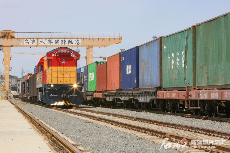 7月9日,一列新疆“天山號”多式聯(lián)運品牌班列駛出烏魯木齊國際陸港區(qū)。石榴云/新疆日報記者蔡增樂 攝
