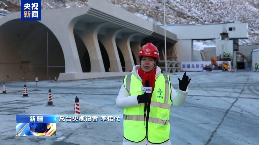 總臺央視記者 李偉代:這里是海拔2800多米的天山勝利隧道施工現(xiàn)場。現(xiàn)在正是中午,一天中氣溫最高的時候,但氣溫也只有零下22攝氏度。我身后就是天山勝利隧道在天山北麓的進(jìn)口端,隧道就是從這里穿越天山,一直打過去到南麓。大家可以看到三個洞口依次排列,未來從烏魯木齊方向開車去庫爾勒,從這個洞口20分鐘就可以穿過隧道。如果從庫爾勒北上來烏魯木齊,車輛就從這個隧道口出來。中間的中導(dǎo)洞通車后將用于應(yīng)急救援等服務(wù)。