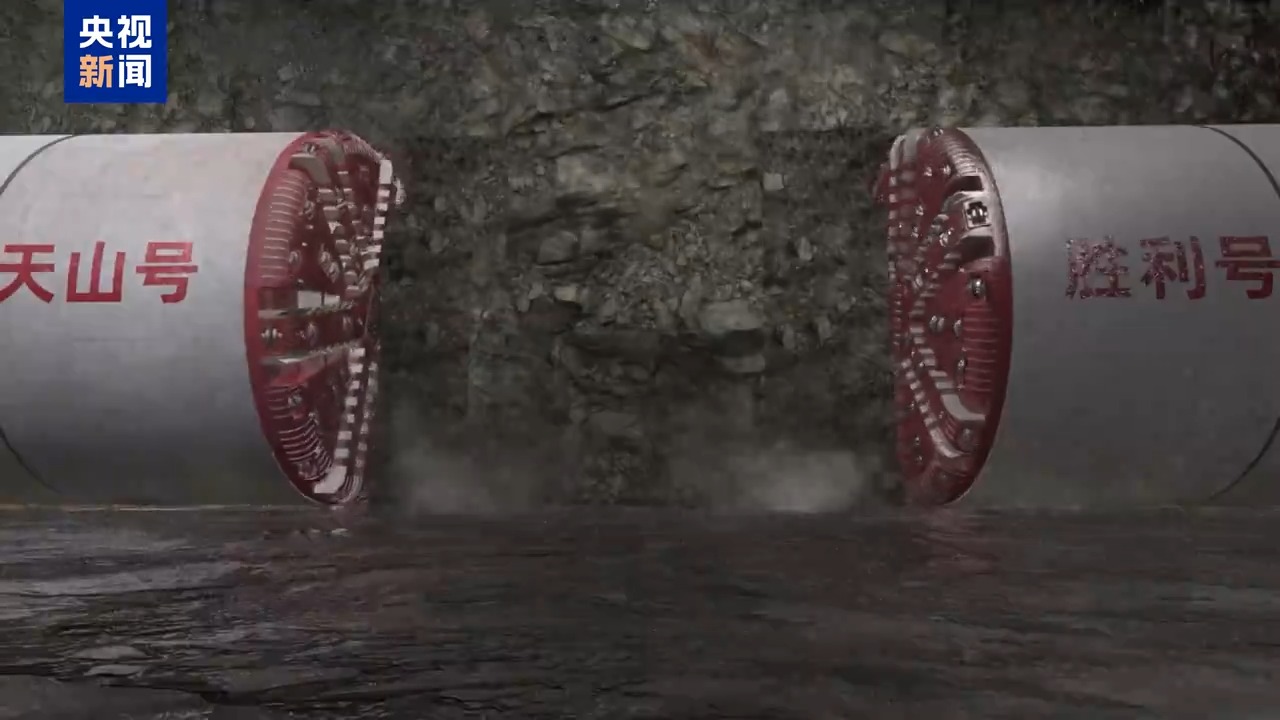中導(dǎo)洞里,這兩個分別長283米、刀盤直徑接近3層樓房高、重量約2000噸的鋼鐵“巨無霸”是為中導(dǎo)洞的快速掘進(jìn)專門“量身定制”的利器。名叫“天山號”和“勝利號”的兩臺硬巖掘進(jìn)機(jī)分別從隧道兩端向中間掘進(jìn)。