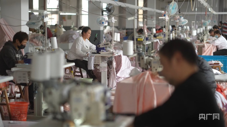 家紡企業(yè)車間里,工人在生產線上忙碌(央廣網記者 楊夢奎 攝)