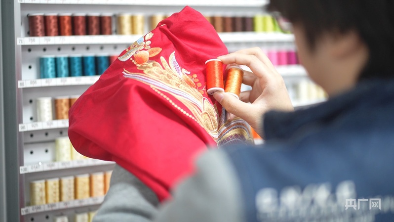 家紡企業(yè)內,設計師在眾多繡花線中選色(央廣網記者 王姝姝 攝)