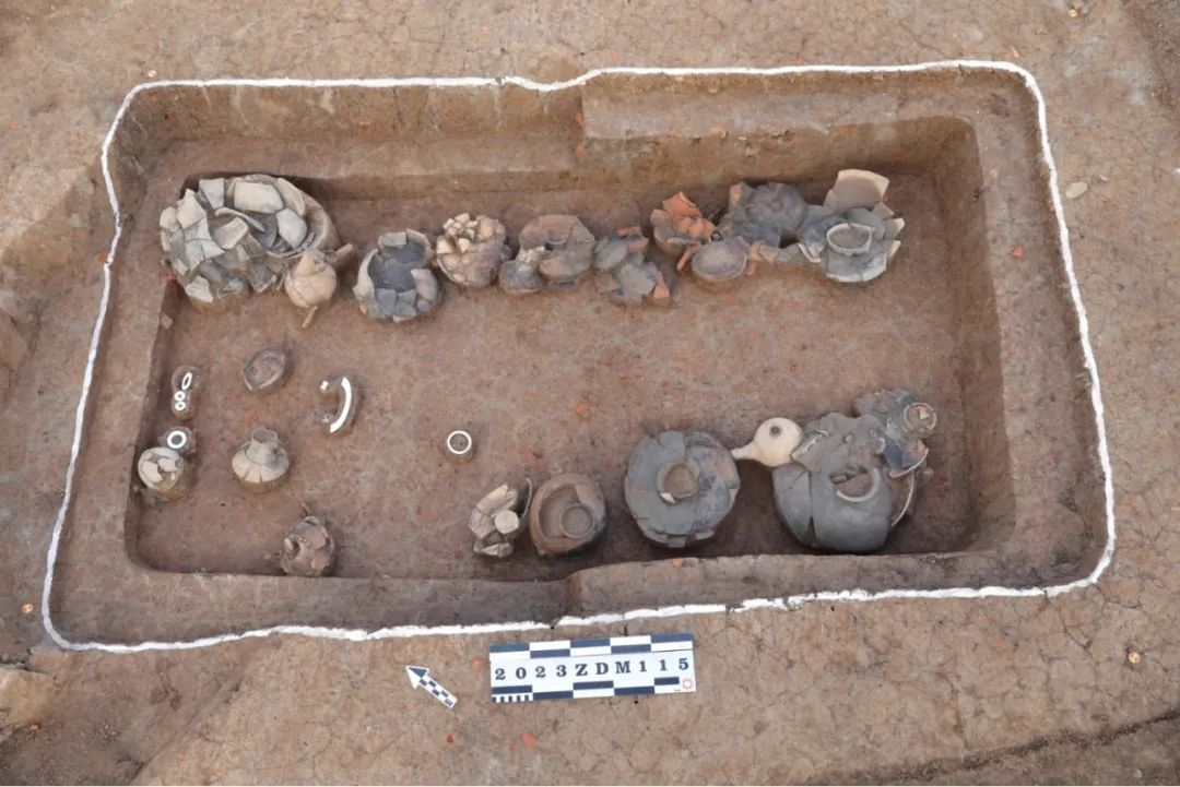 2023年以來,省文物考古研究院圍繞明晰遺址內(nèi)部布局和確認(rèn)遺址宏觀結(jié)構(gòu)兩個(gè)方面,再次開展對(duì)東山村遺址的主動(dòng)性考古發(fā)掘。截至目前,共發(fā)掘新石器時(shí)代大型紅燒土堆積4處、墓葬17座、房址1座、灰坑20座、灰溝1條、水井1口、柱洞3個(gè)。