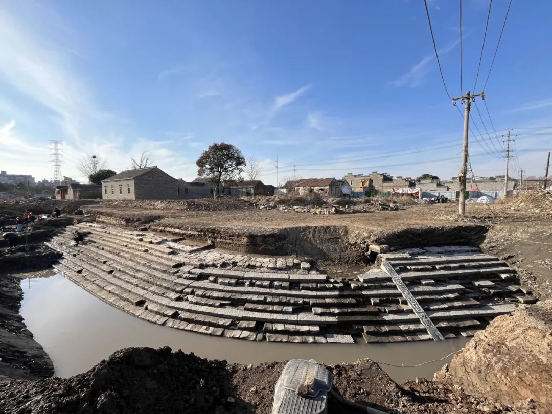2024年6月至10月,揚(yáng)州市文物考古研究所對(duì)子鹽碼頭遺址進(jìn)行了全面考古發(fā)掘。考古表明,子鹽碼頭遺址位于十字河西北岸,為東北—西南走向,呈弧形,寬4.8-5米,全長(zhǎng)約80米。碼頭由踏步石梯和垂帶石組成,踏步石梯殘存十三級(jí)臺(tái)階,由長(zhǎng)方形條石壘砌而成,最底層臺(tái)階下栽有密集的圓木地釘作為碼頭基礎(chǔ)。碼頭南、中、北端共有4根長(zhǎng)條狀垂帶石,飾有如意云紋和“福祿壽喜”紋飾。子鹽碼頭遺址東連都會(huì)橋、攔潮閘,西連九龍橋,是長(zhǎng)江、運(yùn)河交匯處的重要?dú)v史見證,在大運(yùn)河、長(zhǎng)江航運(yùn)史上發(fā)揮了重要作用,也是目前僅存的江北運(yùn)口遺跡,對(duì)研究和展示大運(yùn)河、長(zhǎng)江航運(yùn)文化具有重要價(jià)值。